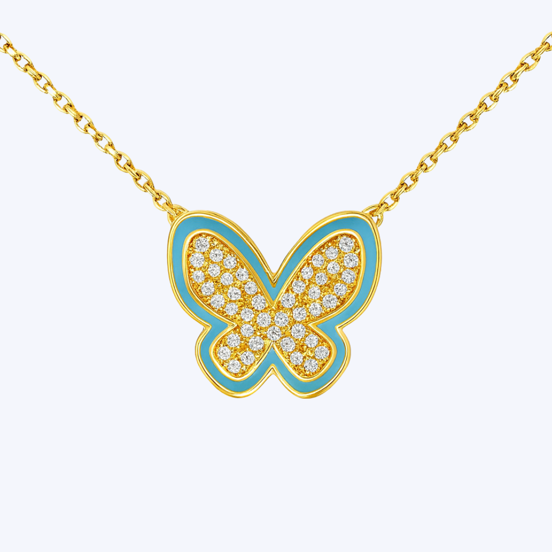 Blue Enamel and Diamond Pave Buttefly Pendant Necklace