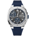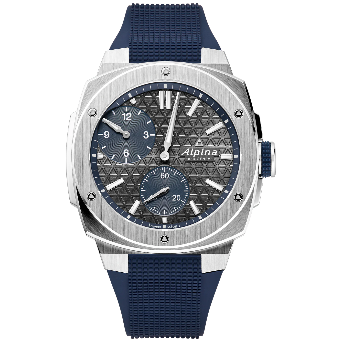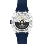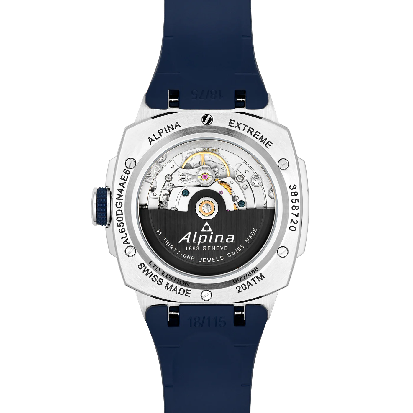 The Alpiner Extreme Automatic is a 41 x 42.5mm rugged sport watch. At the heart of the design, a strong brushed-finish cushion case featuring a navy blue dial with a date window at 3 o'clock and a see-through case-back. The integrated blue rubber strap (with no joining link with the case), made of textured rubber offers as much comfort as strength and modernity. The rubber grip allows for ease of handling with bare hands or with gloves. WR to 200M.