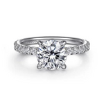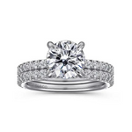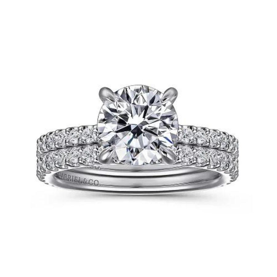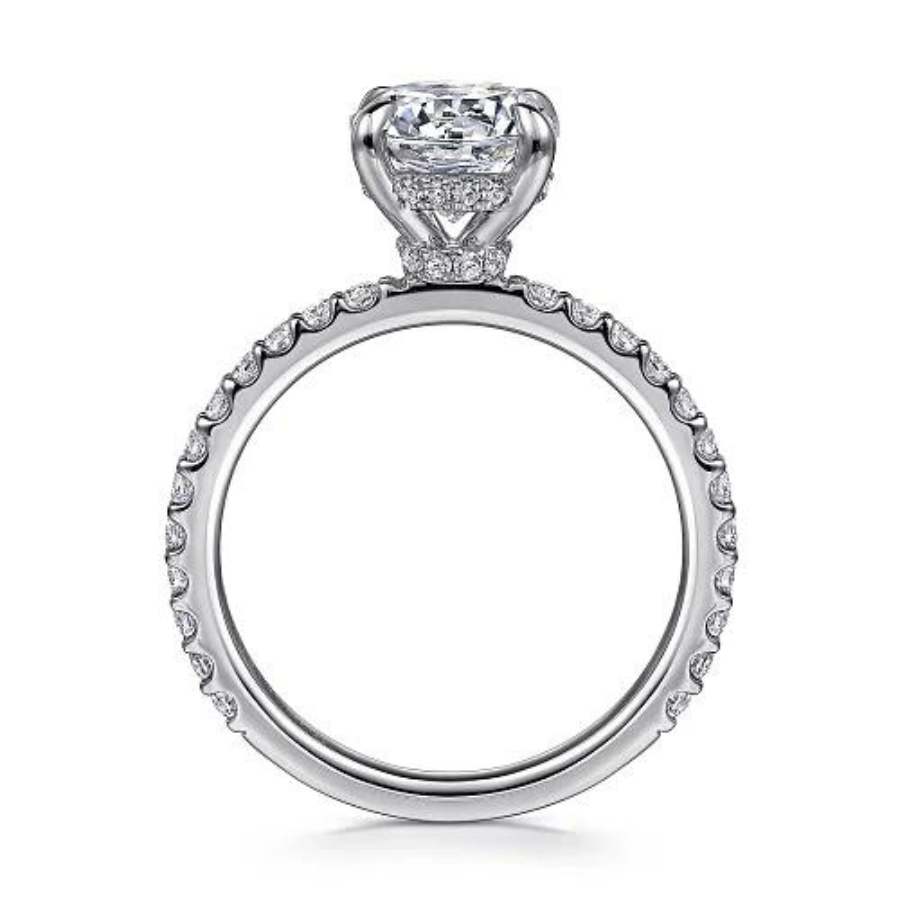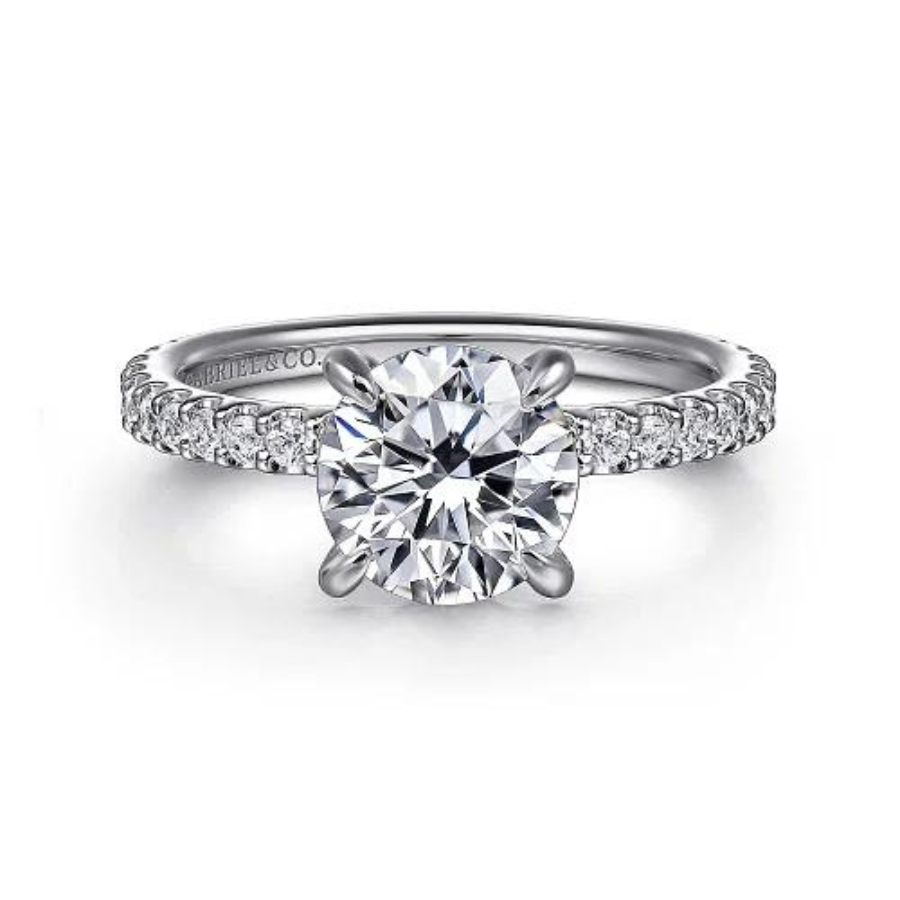 This Gabriel & Co. engagement ring setting features a round brilliant cut diamond with a diamond accented band and a double Hidden Halo.