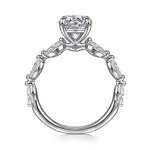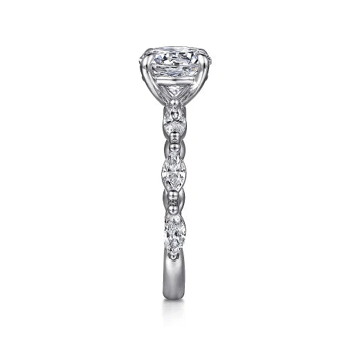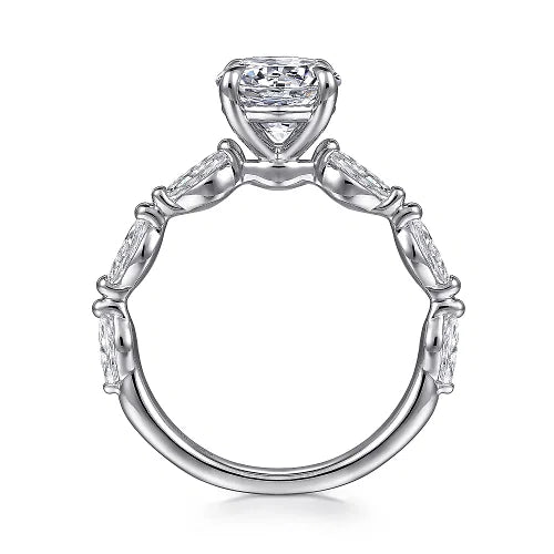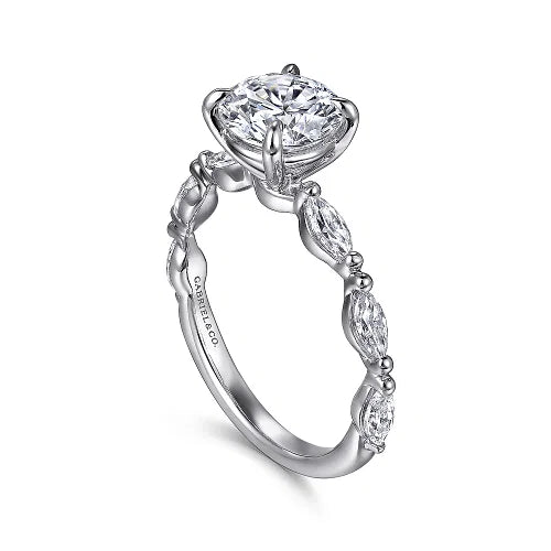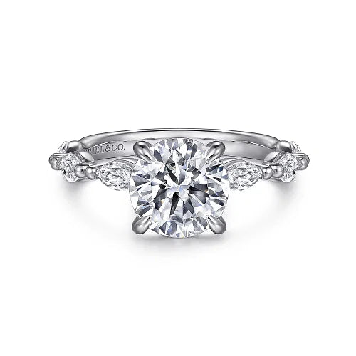 This Gabriel & Co. engagement ring setting features a round cut diamond with a marquise diamond band.