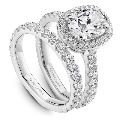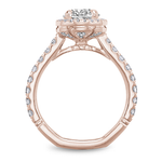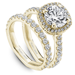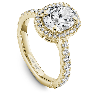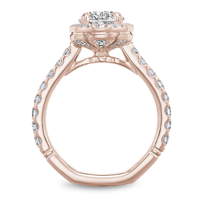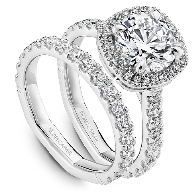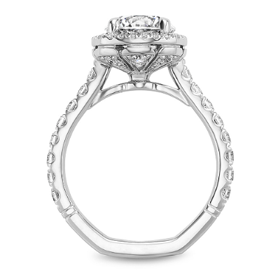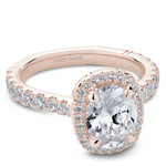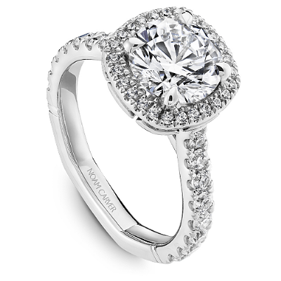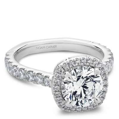 This Noam Carver engagement ring features claw prongs, a cushion halo and diamonds going 75% around the band. This style can be customized to fit a variety of diamond shapes and sizes starting at 0.50 carats, available by special order.