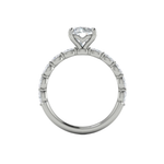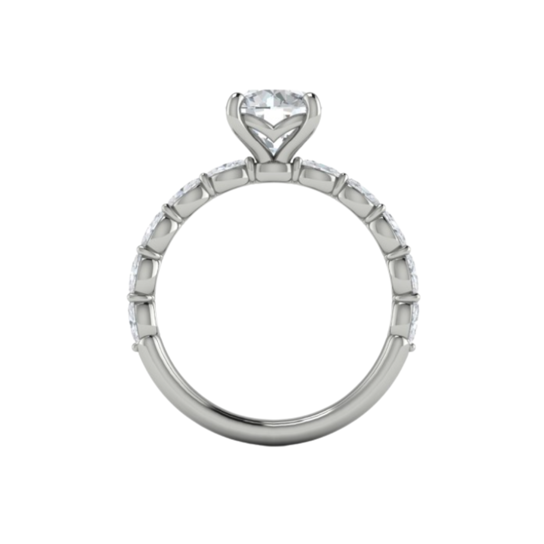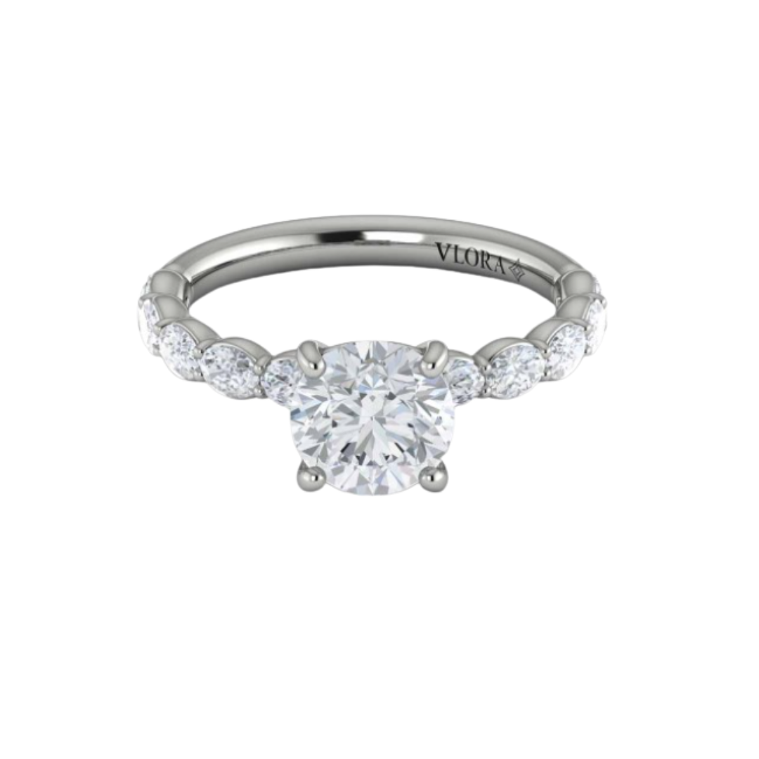 A fusion of elegance and simplicity, this stunning classic engagement ring style features an unusual floating oval diamond band that beautifully complements the round center diamond. Set in Vlora's signature V-shaped setting, the design maximizes light and brilliance, creating a timeless piece that captures the essence of everlasting love.