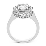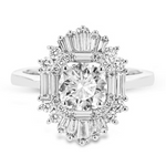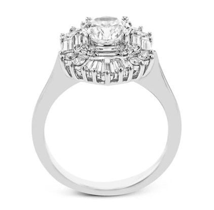 This Simon G engagement ring setting features this distinctive ring is an ode to Art Deco design and features .23 ctw of round diamonds in its halo along with a burst of .70 ctw of baguette diamonds.