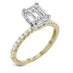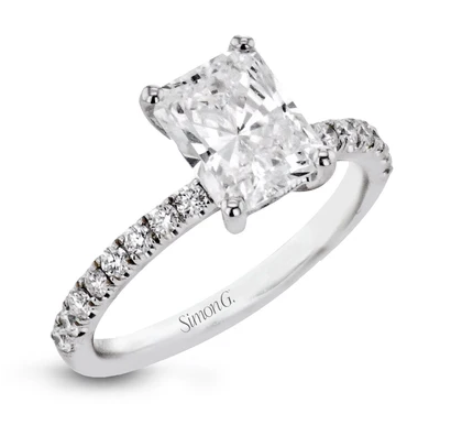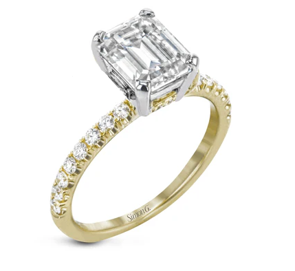 This Simon G engagement ring setting features this emerald cut center stone with diamond pave band.