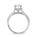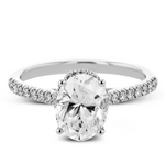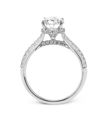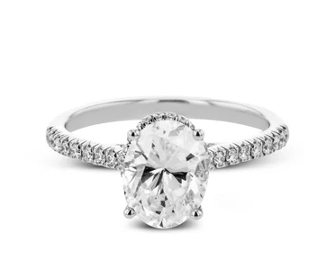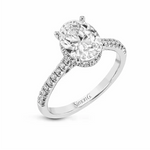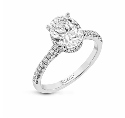 This Simon G engagement ring setting features a oval center stone with hidden halo.