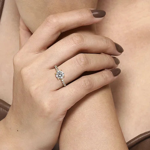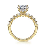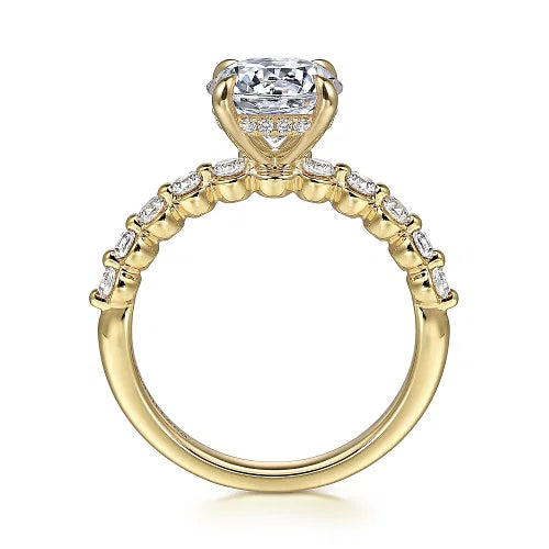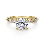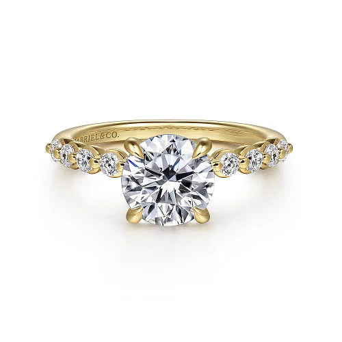 This Gabriel & Co. engagement ring setting features a round cut diamond with a diamond band.