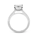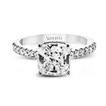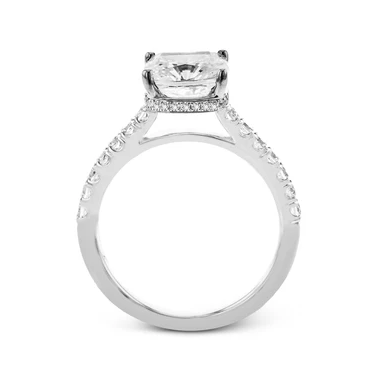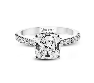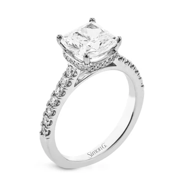 This Simon G engagement ring setting features a cushion cut center stone with hidden halo.