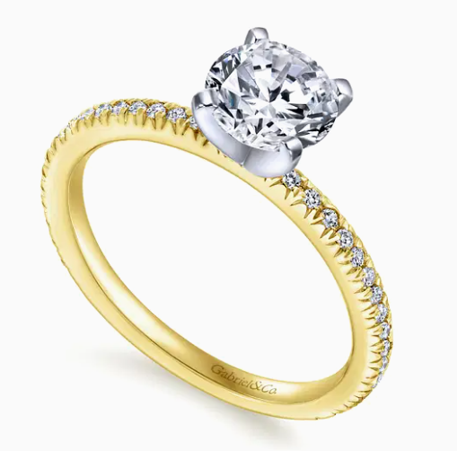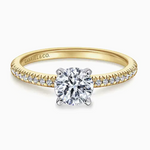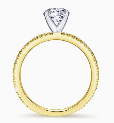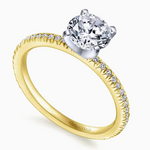 This Gabriel & Co. engagement ring setting features a round center stone with diamond pave band.