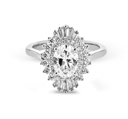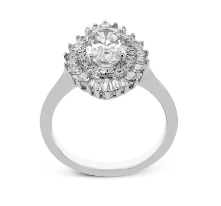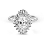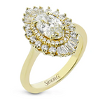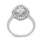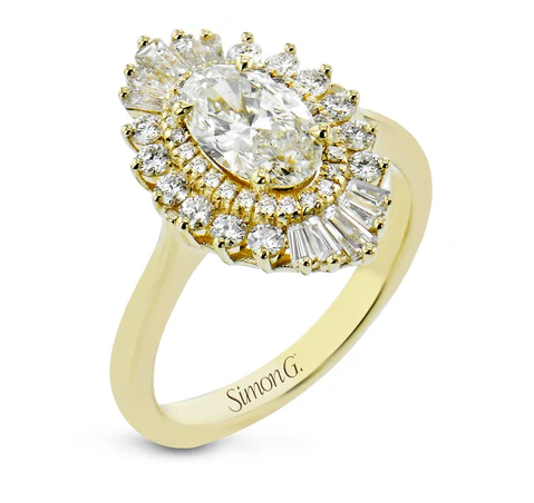 This Simon G engagement ring setting features this distinctive ring made features a halo with of round diamonds surrounded by a spray of brilliant baguette diamonds.