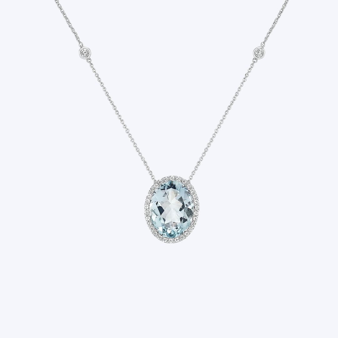 Oval Aquamarine and Diamond Halo Station Pendant Necklace