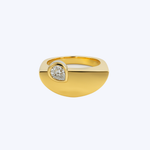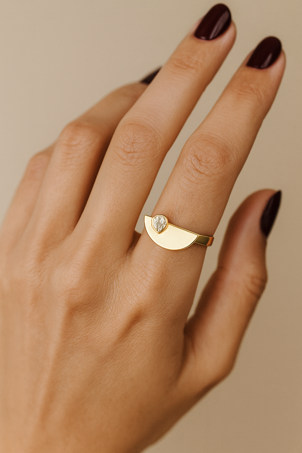 A one-of-a kind modern statement ring featuring a .44ctw colorless pear-shaped diamond set in a sleek half-bezel atop a sculpted 18k yellow solid gold dome. Bold, clean, and contemporary—perfect for everyday elegance.