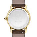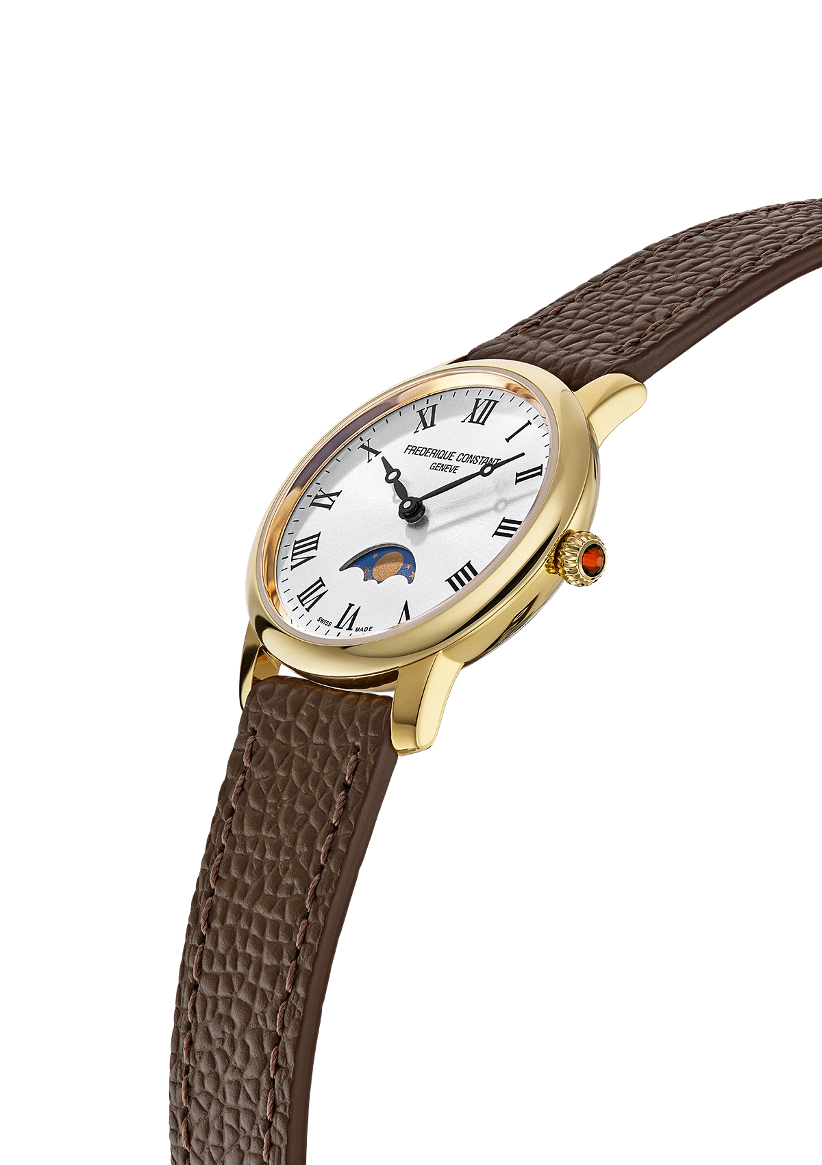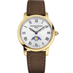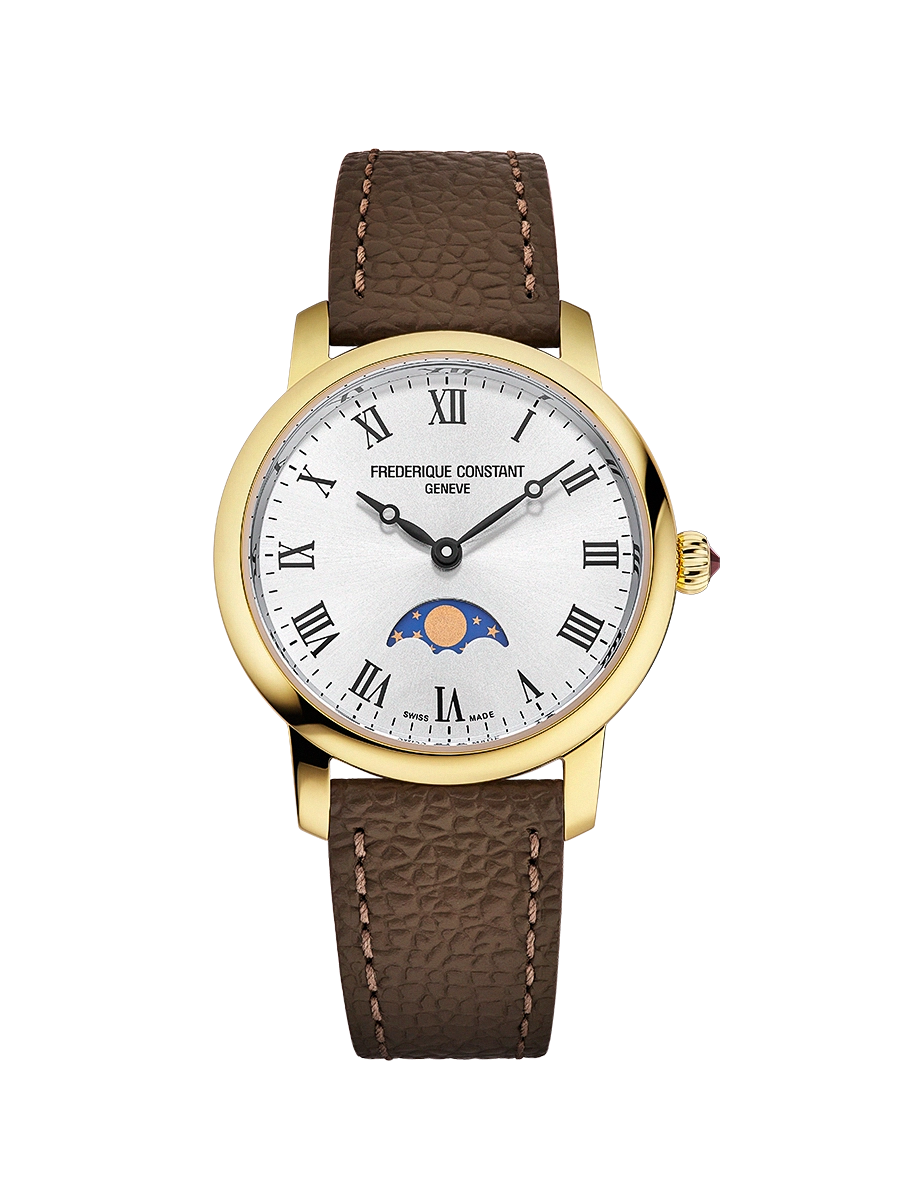 Discover the Classics Slimline Ladies Moonphase, a refined wristwatch that celebrates femininity with a touch of celestial poetry. Its polished yellow gold-plated case, measuring 30 mm in diameter and 7.65 mm in height, houses the FC-206 quartz movement, offering remarkable precision with 5 jewels and a generous battery life of 60 months. The silver dial, enhanced by a sunray finish, is adorned with printed black Roman numerals and elegant black hour and minute hands. The moon phase complication, positioned at 6 o’clock, adds a dreamlike dimension to this piece. Protected by a convex anti-reflective sapphire crystal and water-resistant to 3 ATM (30m/100ft), this watch is completed by a dark brown calfskin leather strap embossed with a crocodile pattern, fastened with a pin buckle, for unrivalled style and comfort.