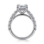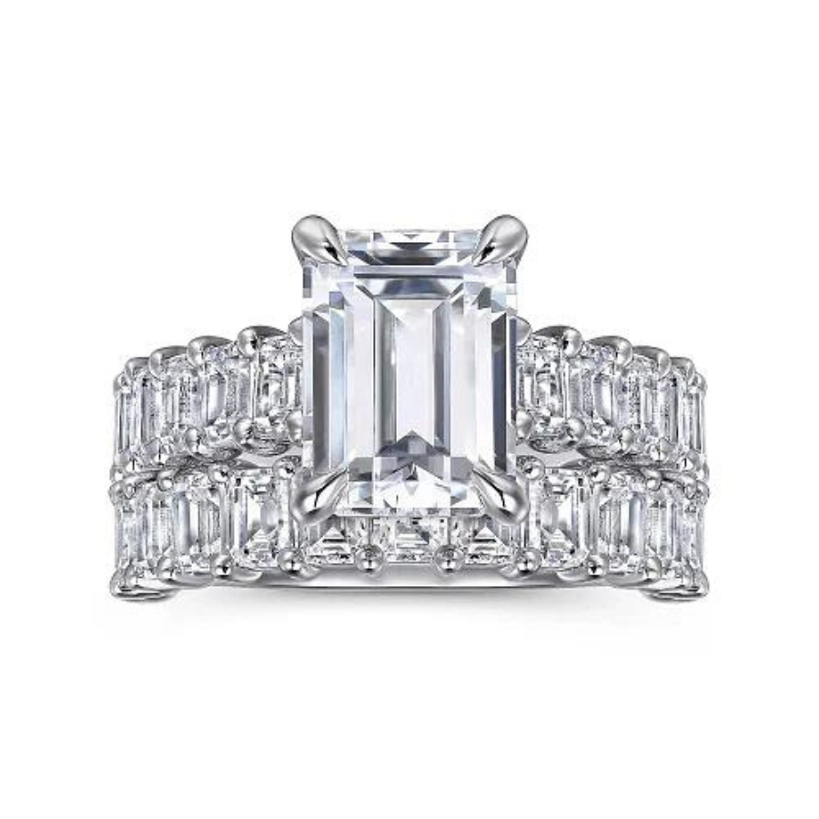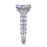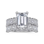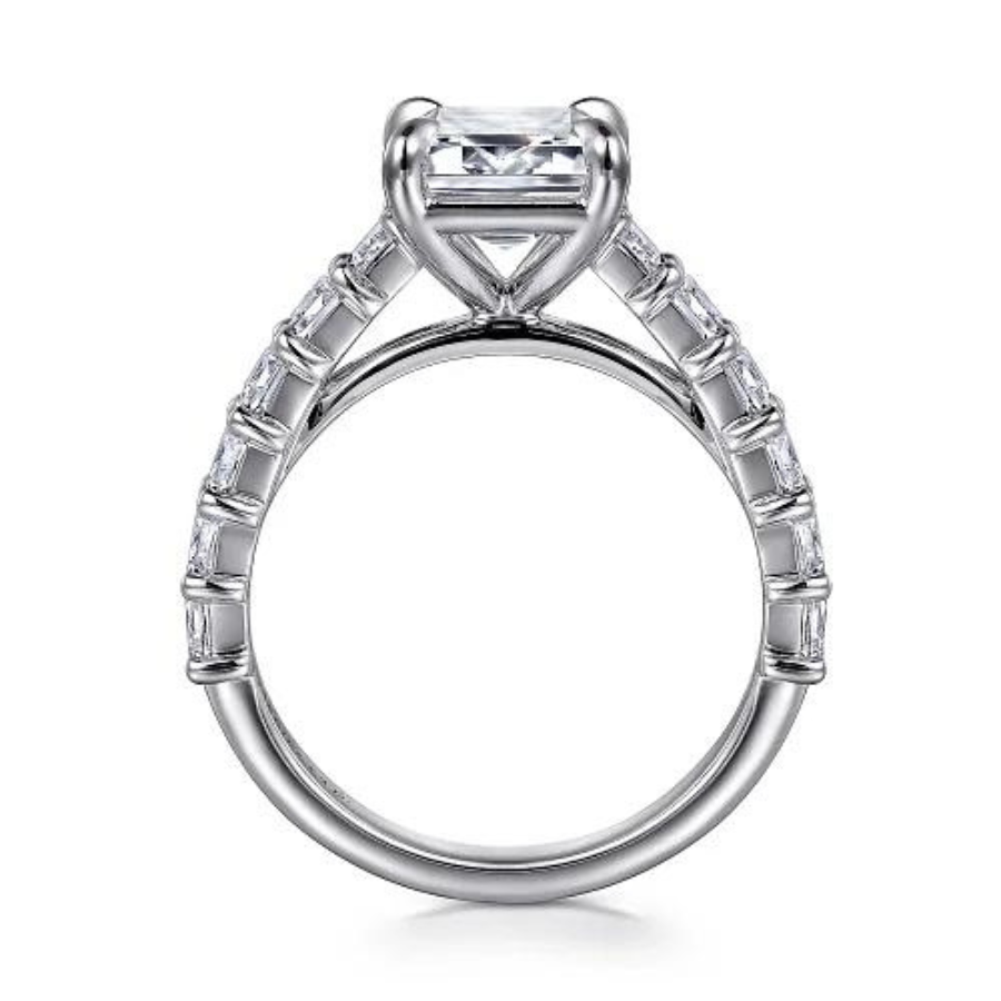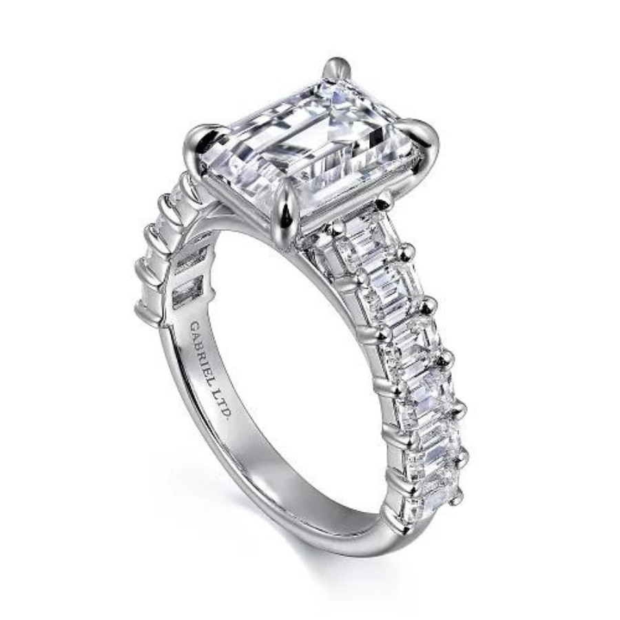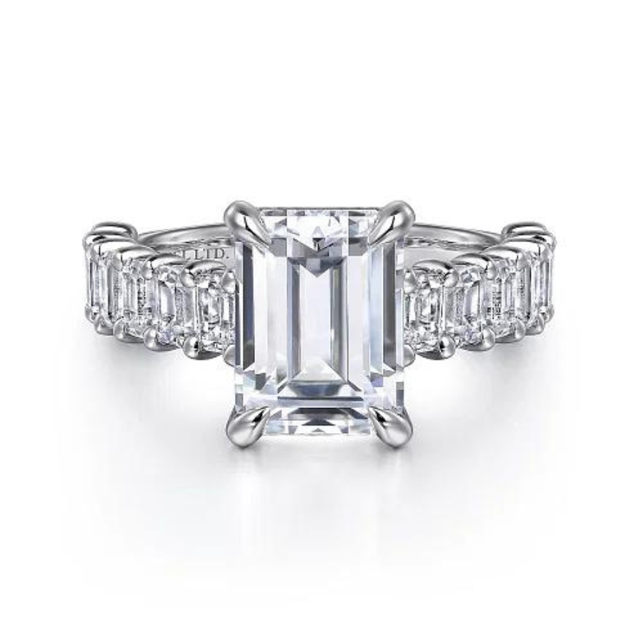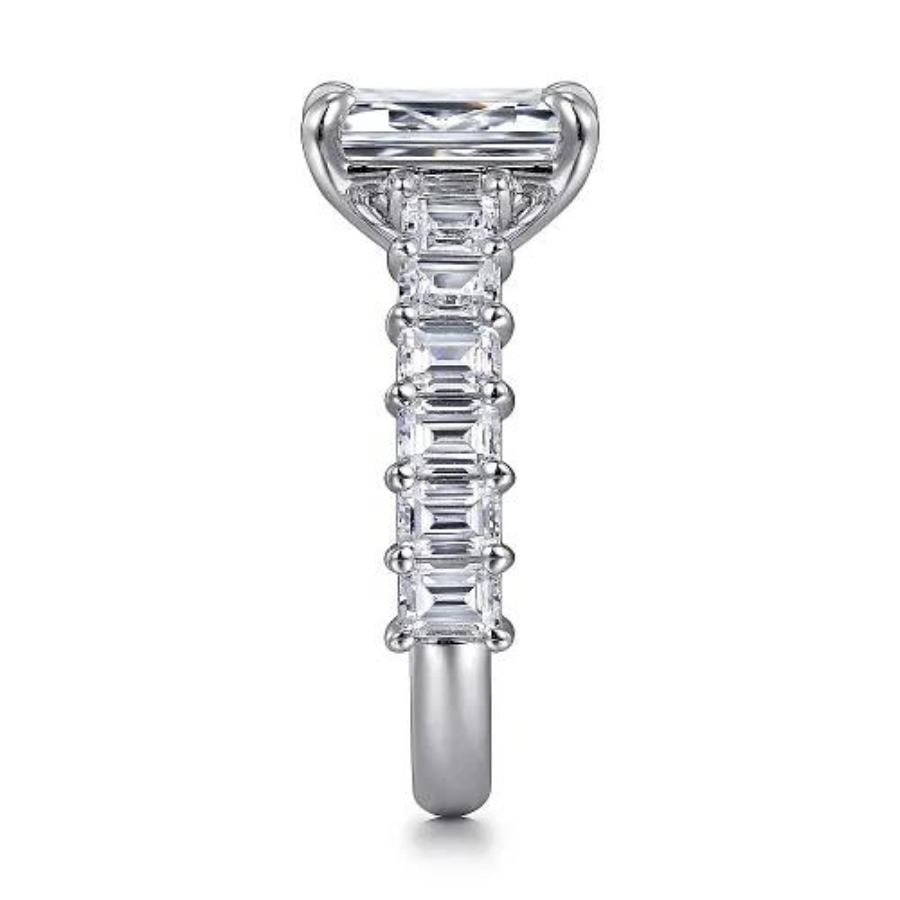 This Gabriel & Co. engagement ring setting features an emerald cut diamond with emerald cut diamonds along the band - all set North/South.