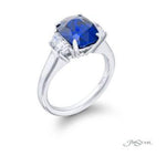 This dazzling JB Star engagement ring features a cushion cut Sapphire embraced between half-moon diamonds. Handcrafted in Platinum.