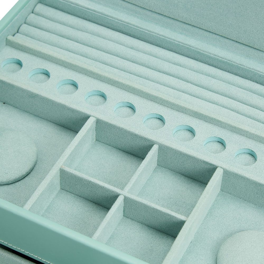 • Storage: 12 round charm storage spaces, 2 bracelet wells, 1 long necklace/bracelet compartment, 10 open storage compartments, 1 empty drawer, 4 ring rolls