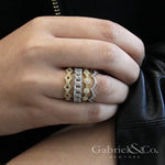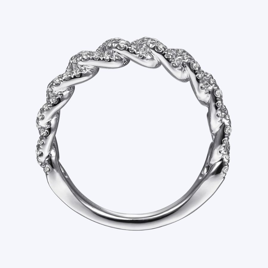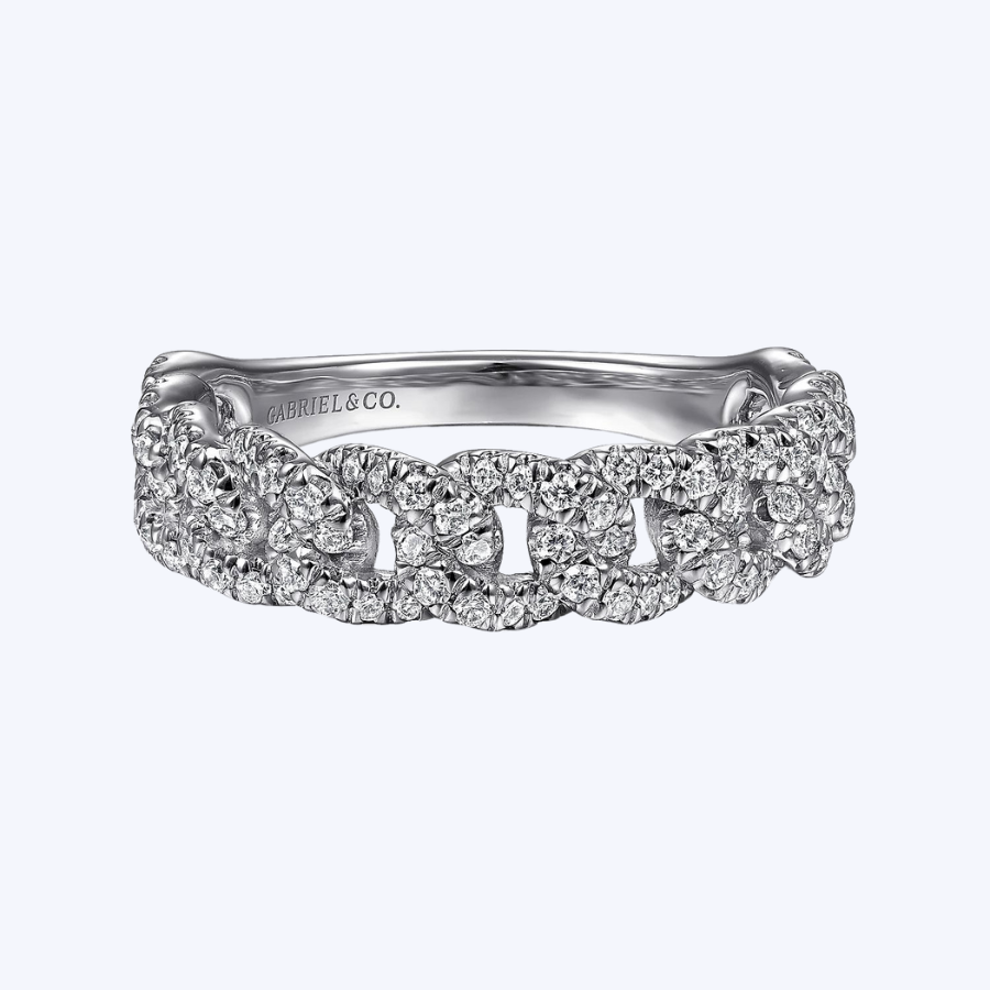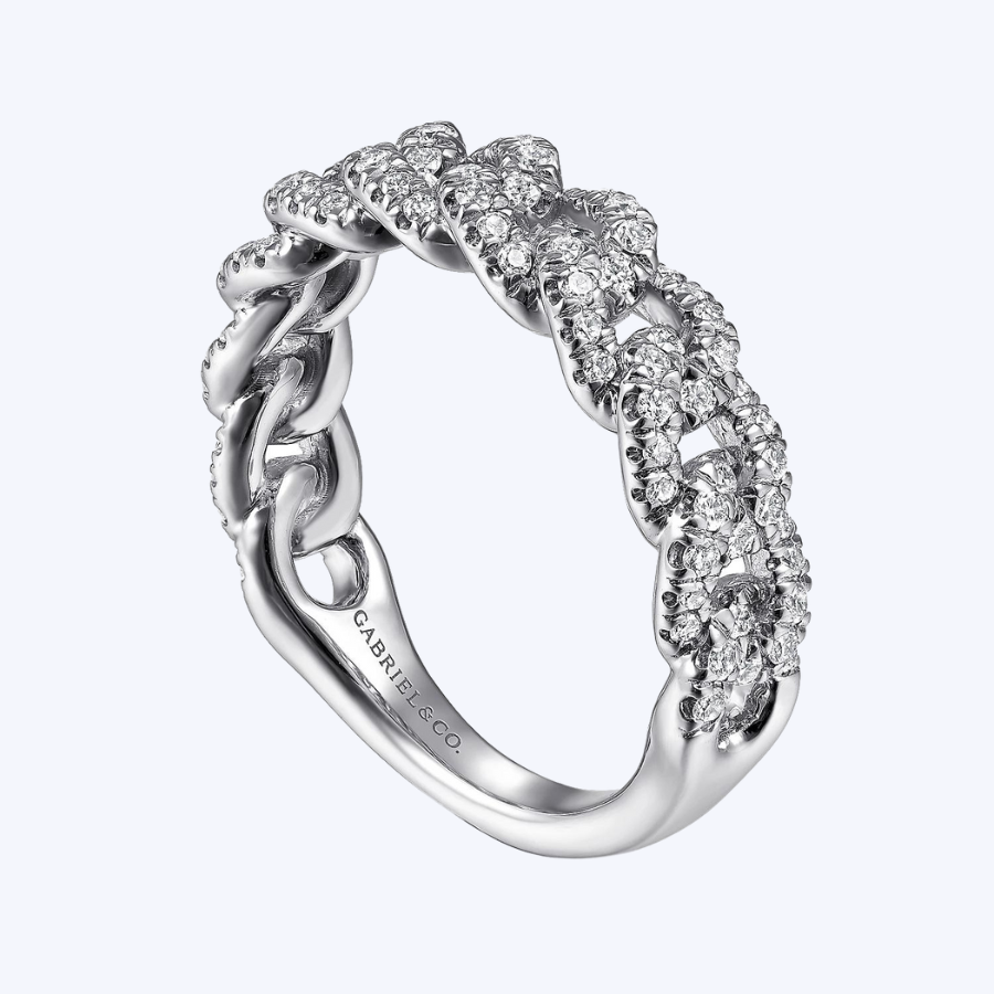 Glittering loops of 14K white gold form an entrancing chain link design around the band of this chic stackable ring. Outlined in magnificent 0.45ct diamonds, this sculpted ring will be the envy of everyone in the room.