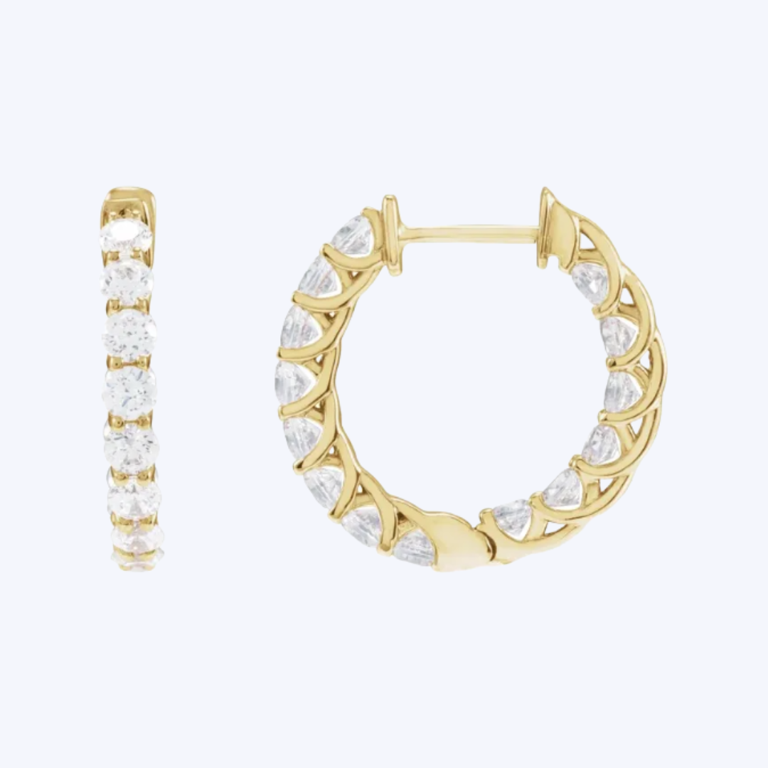 Huggie and hoop earrings feature circular or semi-circular designs that curve around the ear, with huggies sitting close to the earlobe and hoops extending outward in larger diameters. Construction utilizes hinged mechanisms or continuous circular forms with secure closure systems including click-backs or lever mechanisms. These designs often incorporate gemstone settings along the exterior surface using channel, pavé, or individual stone mounting techniques. Highland Diamond's huggie and hoop collection combines precision engineering with elegant proportions for comfortable, secure wear and exceptional brilliance.