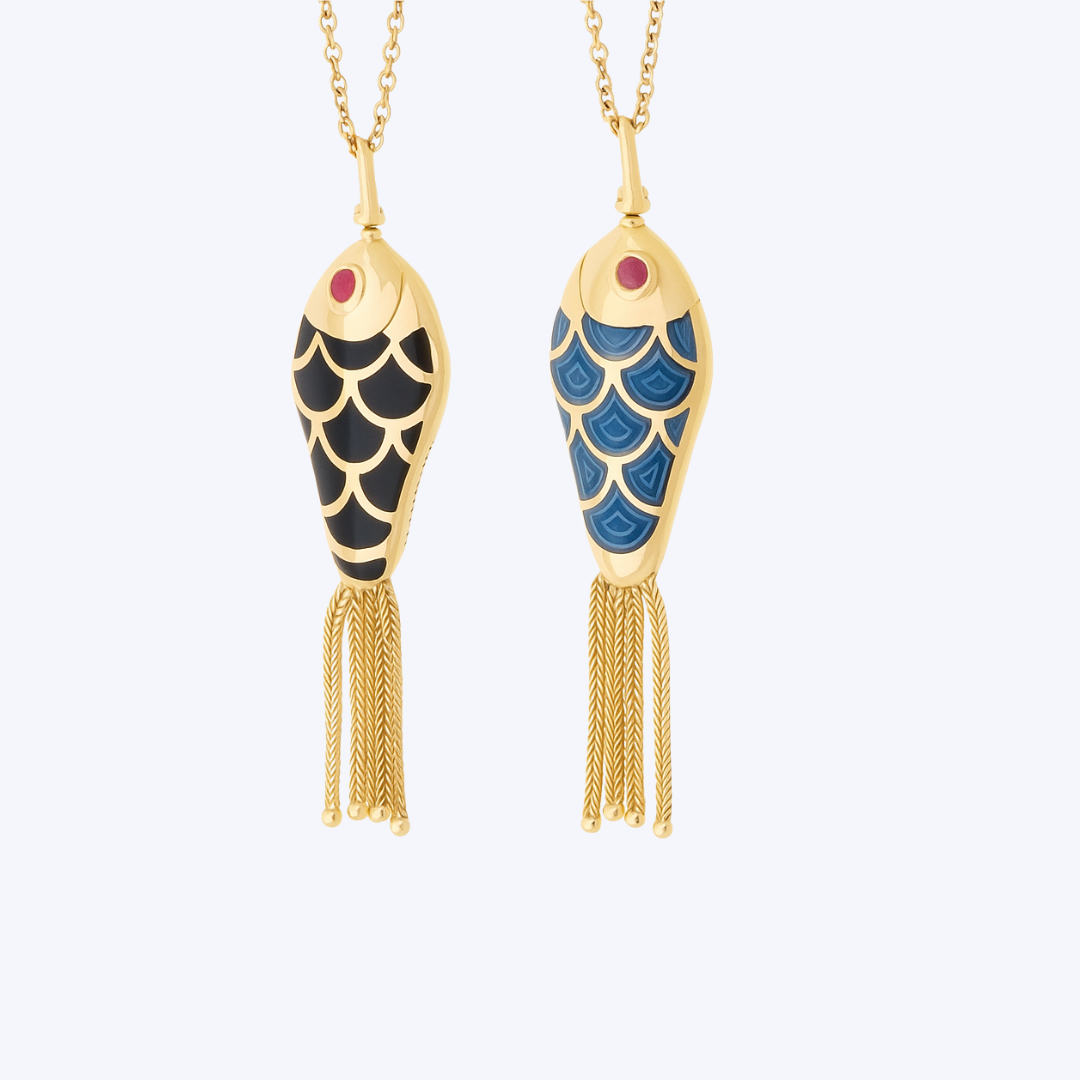 Fish For Love Collection Double-Sided Black and Navy Blue Enamel Set with Rubies Necklace