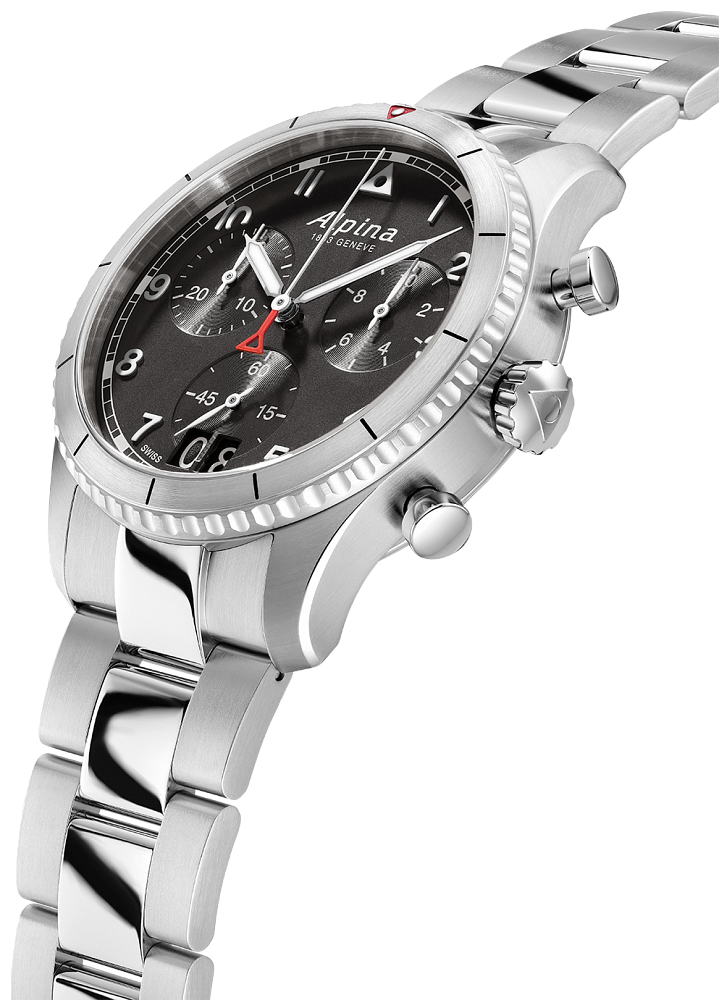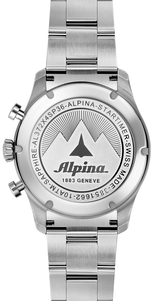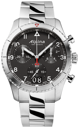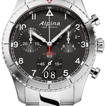 The Alpina Startimer Pilot Quartz Chronograph Big Date, inspired by its heritage look and incomparable precision, comes in a 41mm case with the case back engraved with an airplane about to fly over a mountain, and the vintage version of the Alpina logo. WR to 100M. The black dial has white indexes, the date at 6 o'clock and a bicompax chronograph, ideal for calculating flight times as it is able to measure to the 10th of a second. Set on a steel bracelet. Perfect for the aviator at heart.