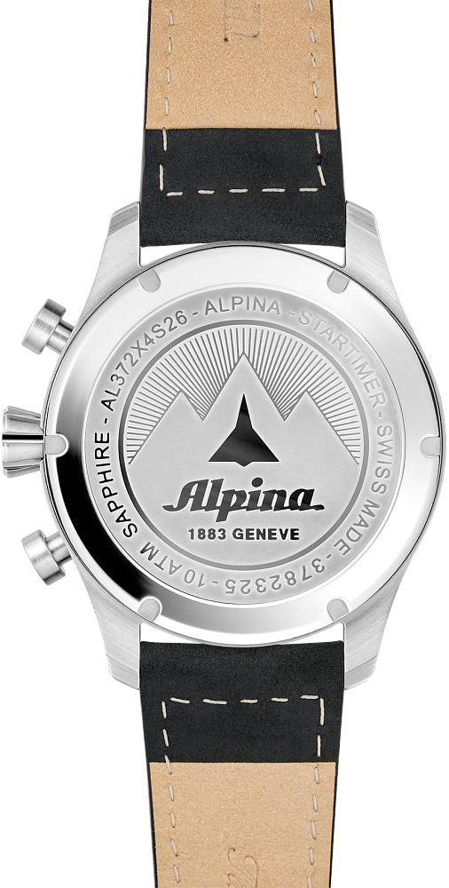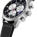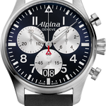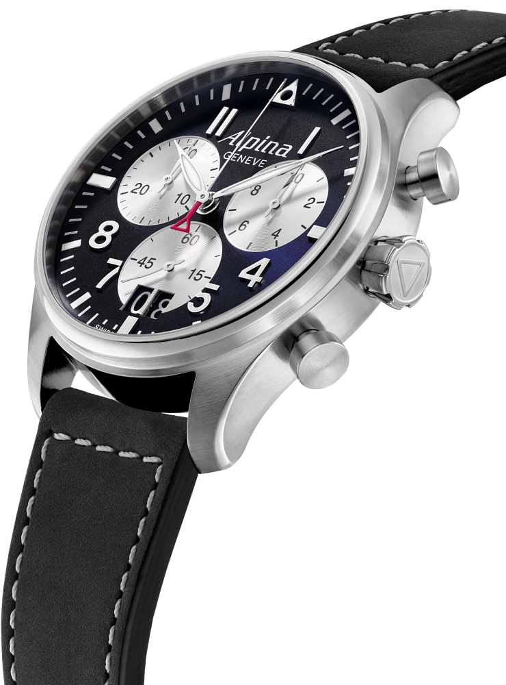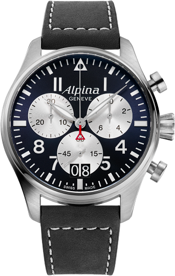 The Startimer Pilot Chronograph Big Date, is inspired by the heritage look and incomparable precision. This stylish 30 minute chronograph offers 1/10 of a second timing and date function. The large 44 mm case features a compax chronograph, accompanied by a large date at 6 o’clock. This is a rare complication in fine watchmaking. It enables you to display the date on two separate discs, one for the tens, the other for the units. The technique also allows for wide format windows that make reading the date as easy as can be. With an autonomy of 4 years (48 months), the design features an engraved case back, large hand-polished hands, luminescent Arabic numerals, 10 ATM (100 metres) of water resistance, a calfskin leather strap, two push buttons and a seconds hand finished with Alpina's signature red triangle, inspired by the brand’s Alpine roots. Perfect for the aviator at heart.