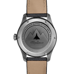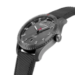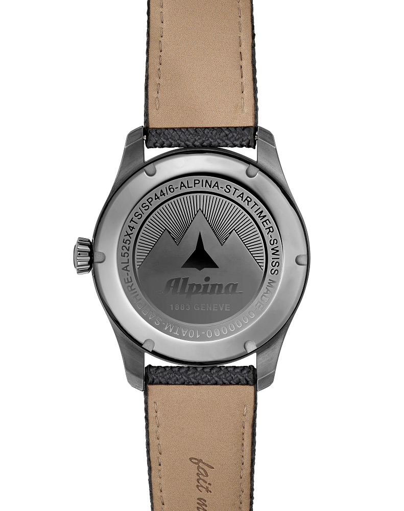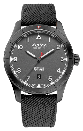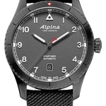 Whether you're flying high or laying low, the Startimer Pilot Automatic provides Alpina's legendary accuracy and functionality. Standing by its strong aviation history dating back to 1920, Alpina introduces this automatic, brushed and polished 41mm stainless steel titanium black PVD plated 2-part case with engraved case back. It features a dark grey dial with matte finishing and printed white Arabic numbers, silver-tone hour and minute hands with silver-tone luminous treatment and a silver-tone second hand with signature Alpina red triangle. Big date window at 6 o'clock. Water resistant to 100M, it comes on a grey RPET (recycled plastic) strap.