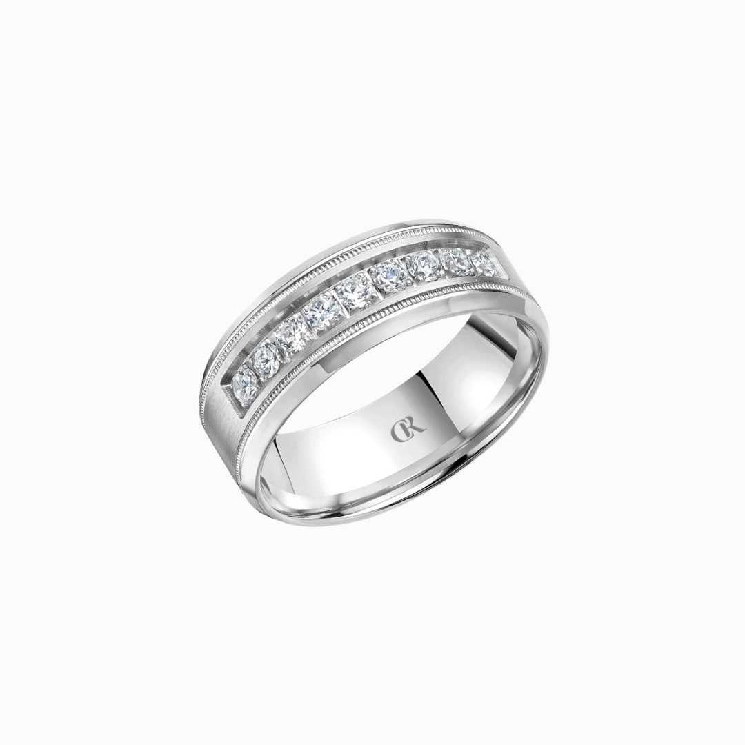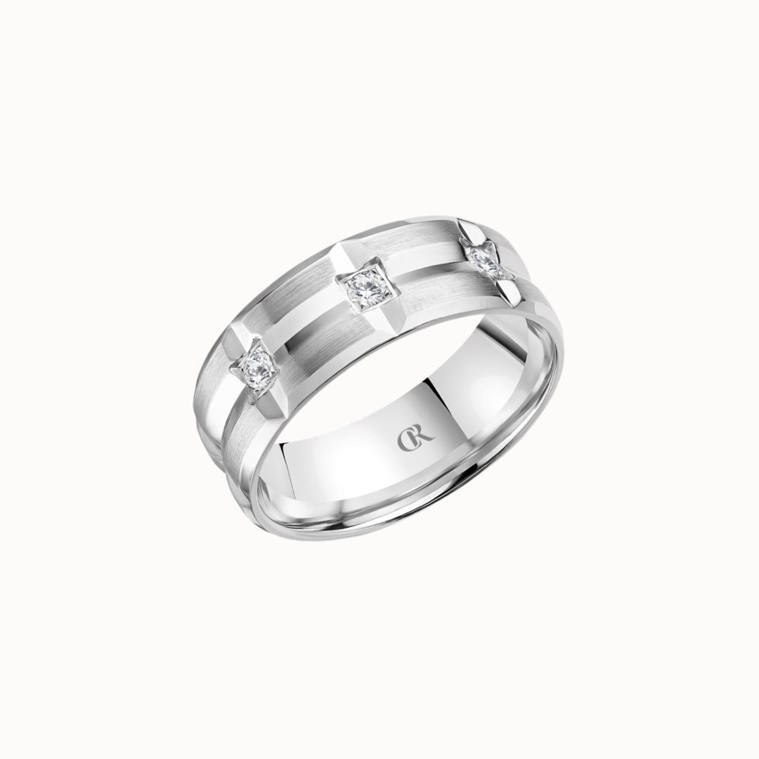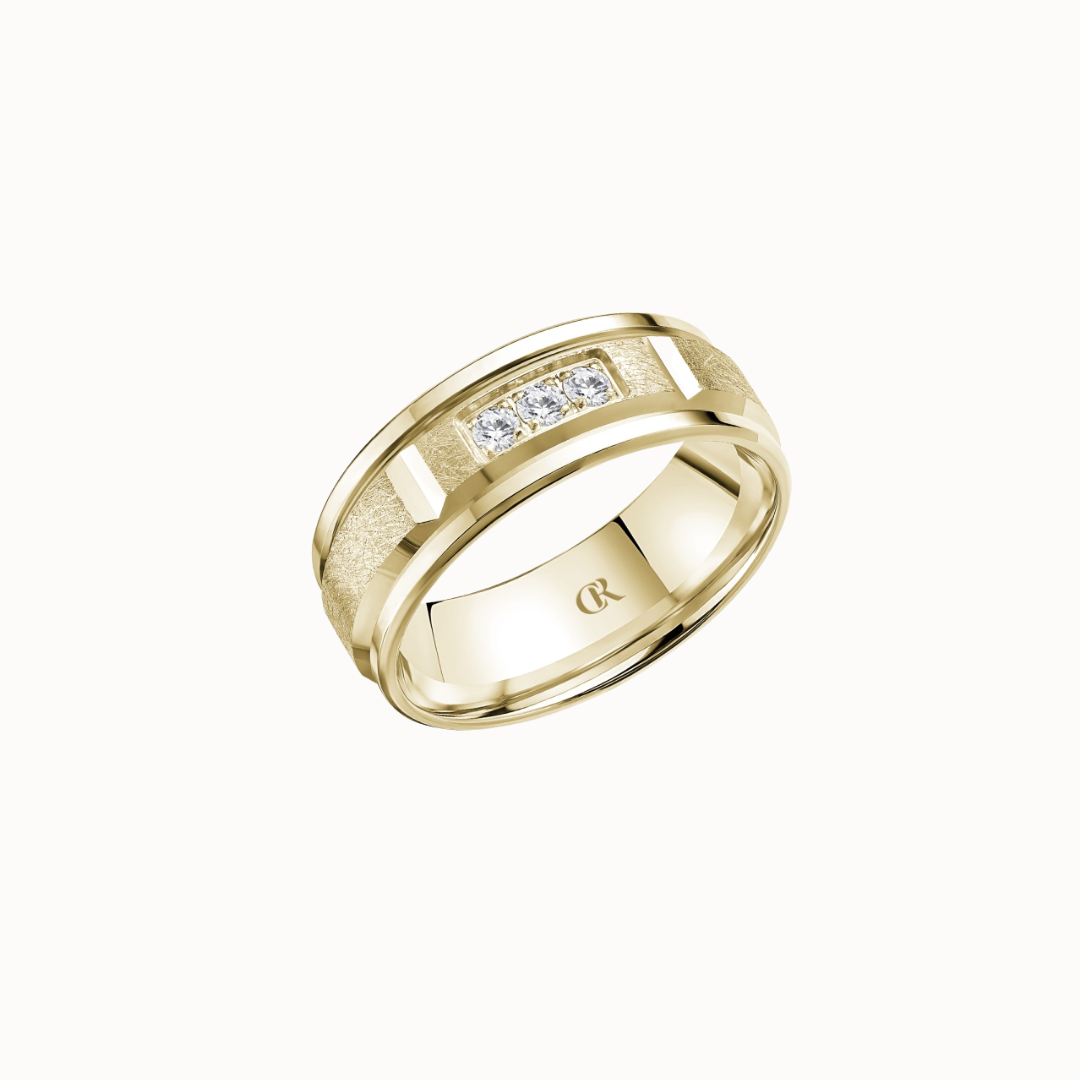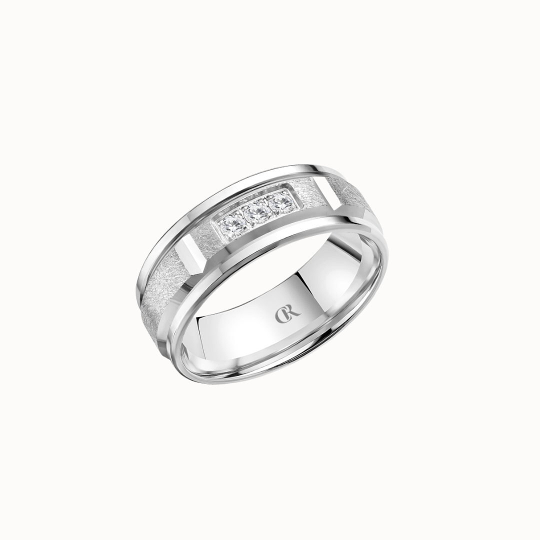 Crown 8mm Diamond Brush Center with Diamond Accents, Textured Insets, and High Polish Cuts & Sides Band