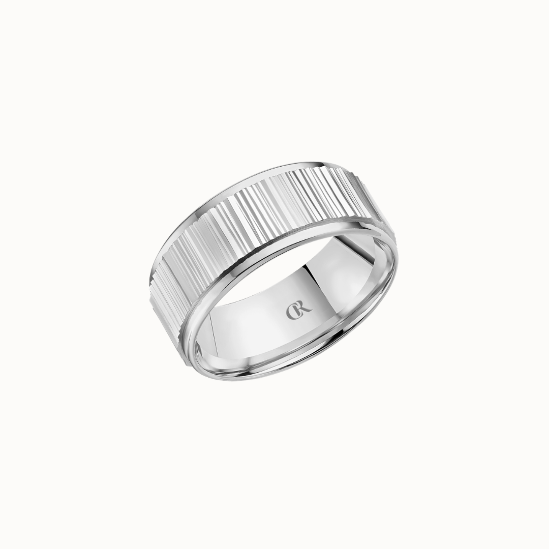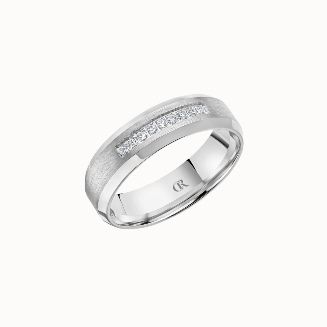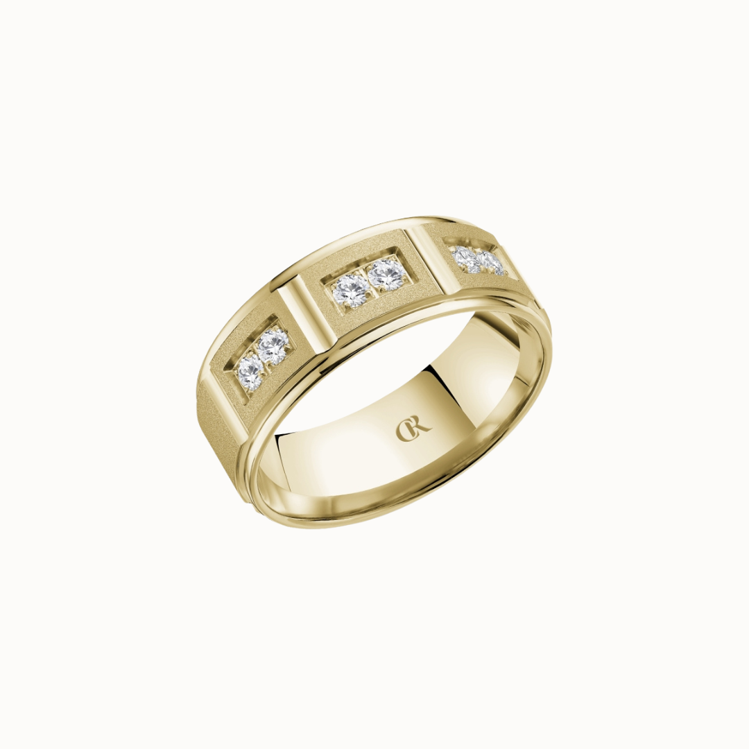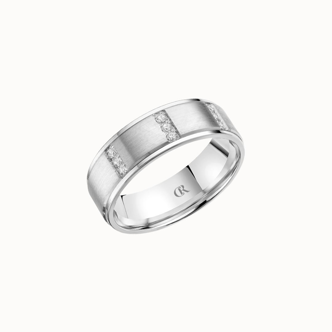 Crown 8mm Diamond Brush Center with Diamond Accents, Textured Insets, and High Polish Cuts & Sides Band