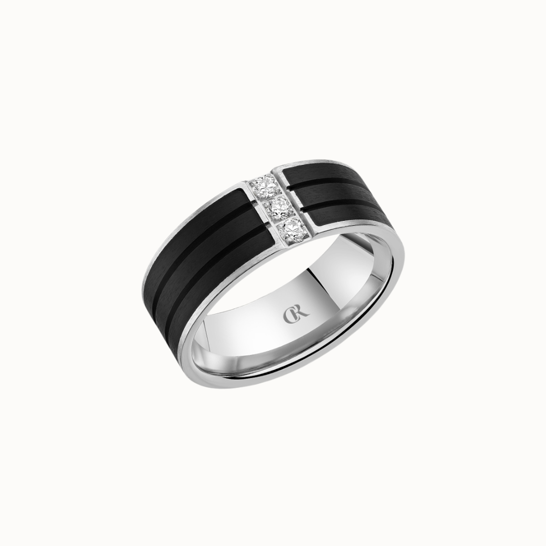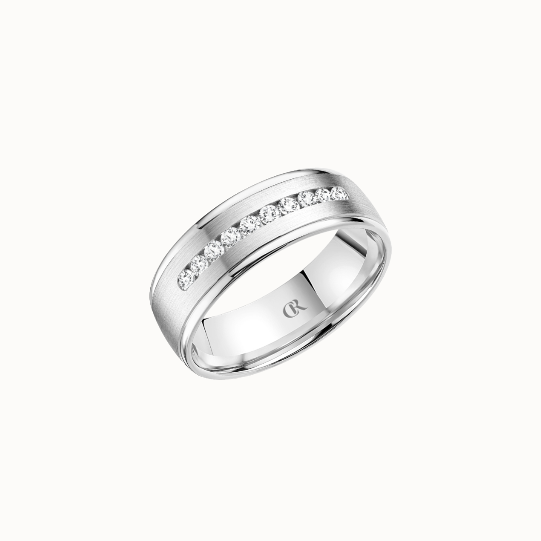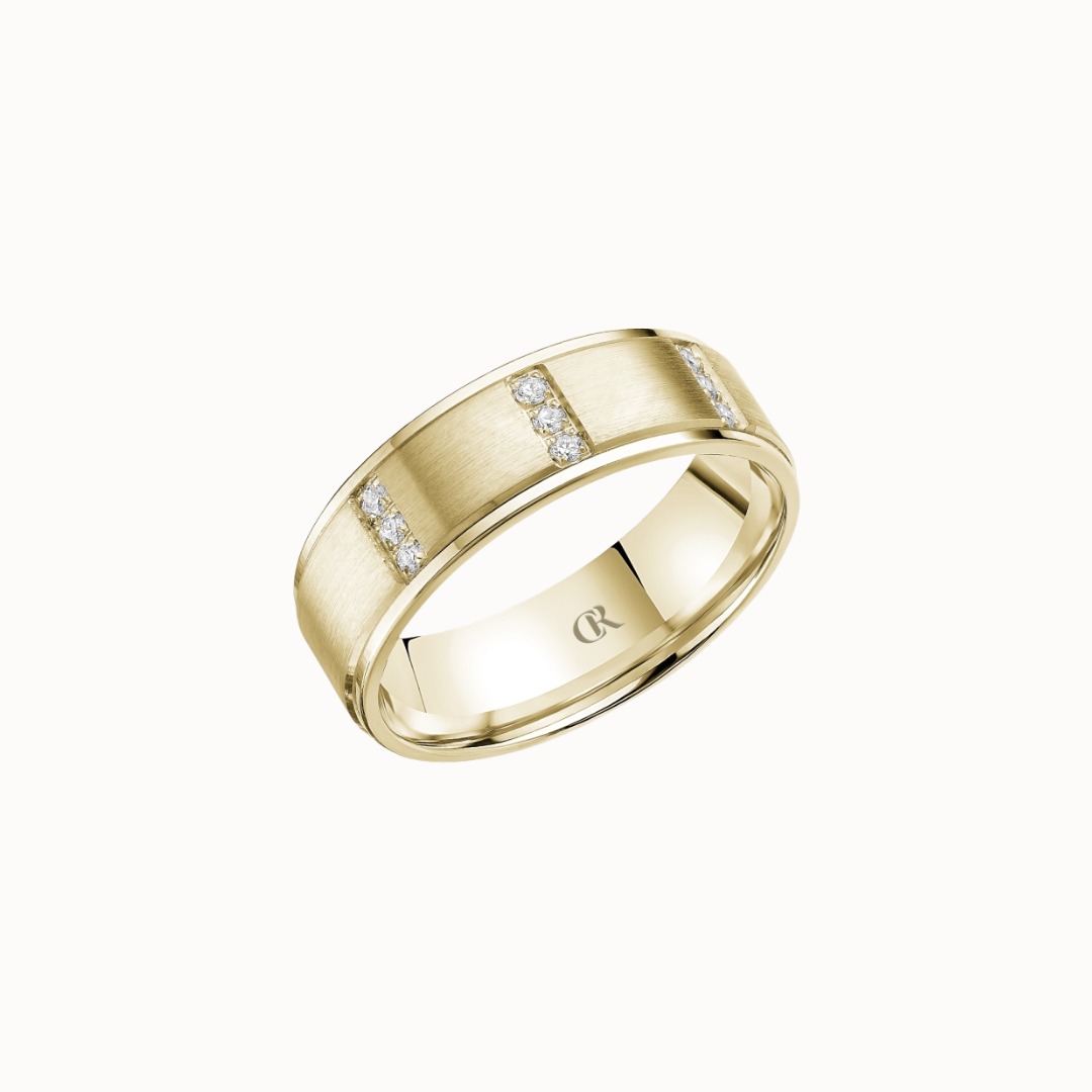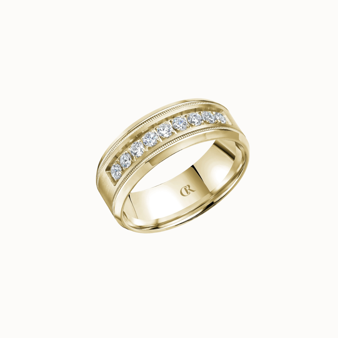 Crown 8mm Diamond Brush Center with Diamond Accents, Textured Insets, and High Polish Cuts & Sides Band