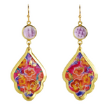 A festive explosion of flowers of all colors – saffron, fuchsia, turquoise, hyacinth – adorns these whimsical earrings. Appropriate for all seasons. Crowned with glowing amethysts and burnished with luminous 22K gold leaf for a luxurious finish.