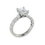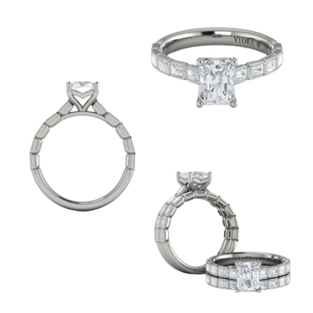 Channel the essence of modern sophistication with this striking emerald cut engagement ring designed for the strong woman who dares to stand out. The emerald cut diamond, elevated in Vlora's signature V-shaped setting, shines like a beacon of your love. A streamlined band of sleek bezel set emerald cut diamonds captures Art Deco’s geometric allure, reflecting strength and grace. This exquisite piece intertwines tradition with contemporary flair, creating a memorable symbol of commitment and timeless love.