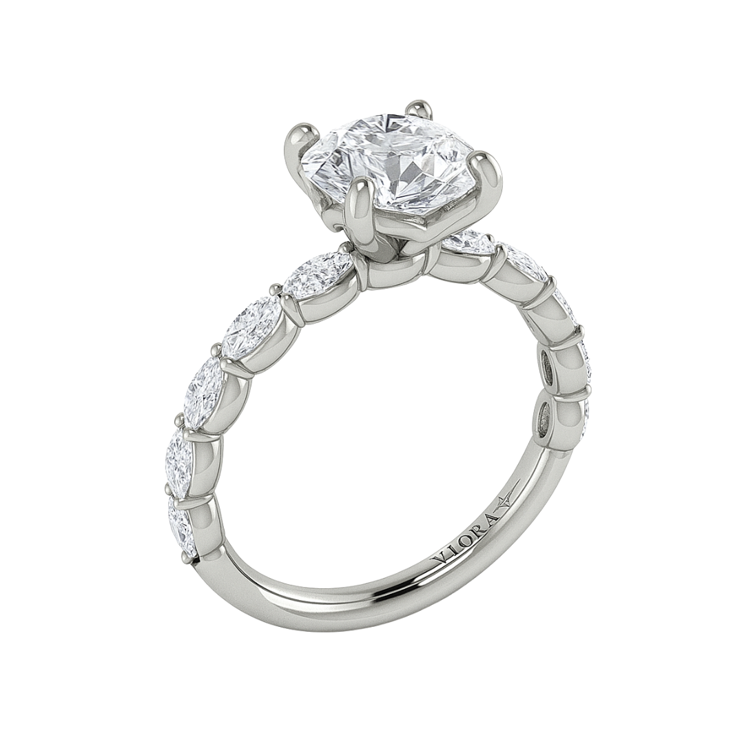 A fusion of elegance and simplicity, this stunning classic engagement ring style features an unusual floating oval diamond band that beautifully complements the round center diamond. Set in Vlora's signature V-shaped setting, the design maximizes light and brilliance, creating a timeless piece that captures the essence of everlasting love.