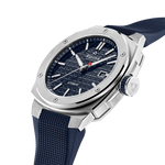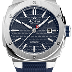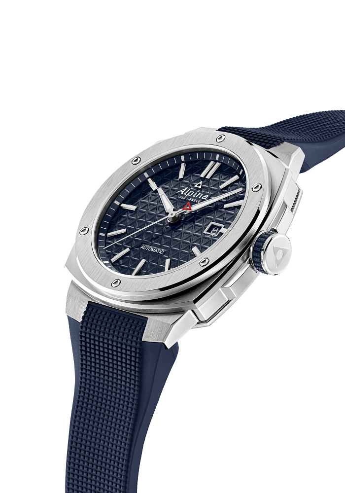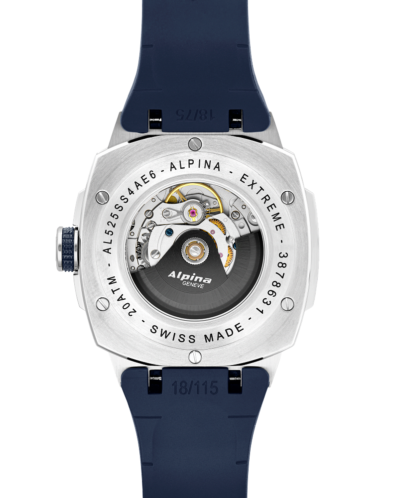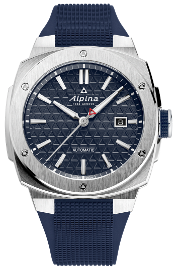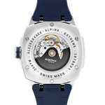The Alpiner Extreme Automatic is a 41 x 42.5mm rugged sport watch. At the heart of the design, a strong brushed-finish cushion case featuring a navy blue dial with a date window at 3 o'clock and a see-through case-back. The integrated blue rubber strap (with no joining link with the case), made of textured rubber offers as much comfort as strength and modernity. The rubber grip allows for ease of handling with bare hands or with gloves. WR to 200M.