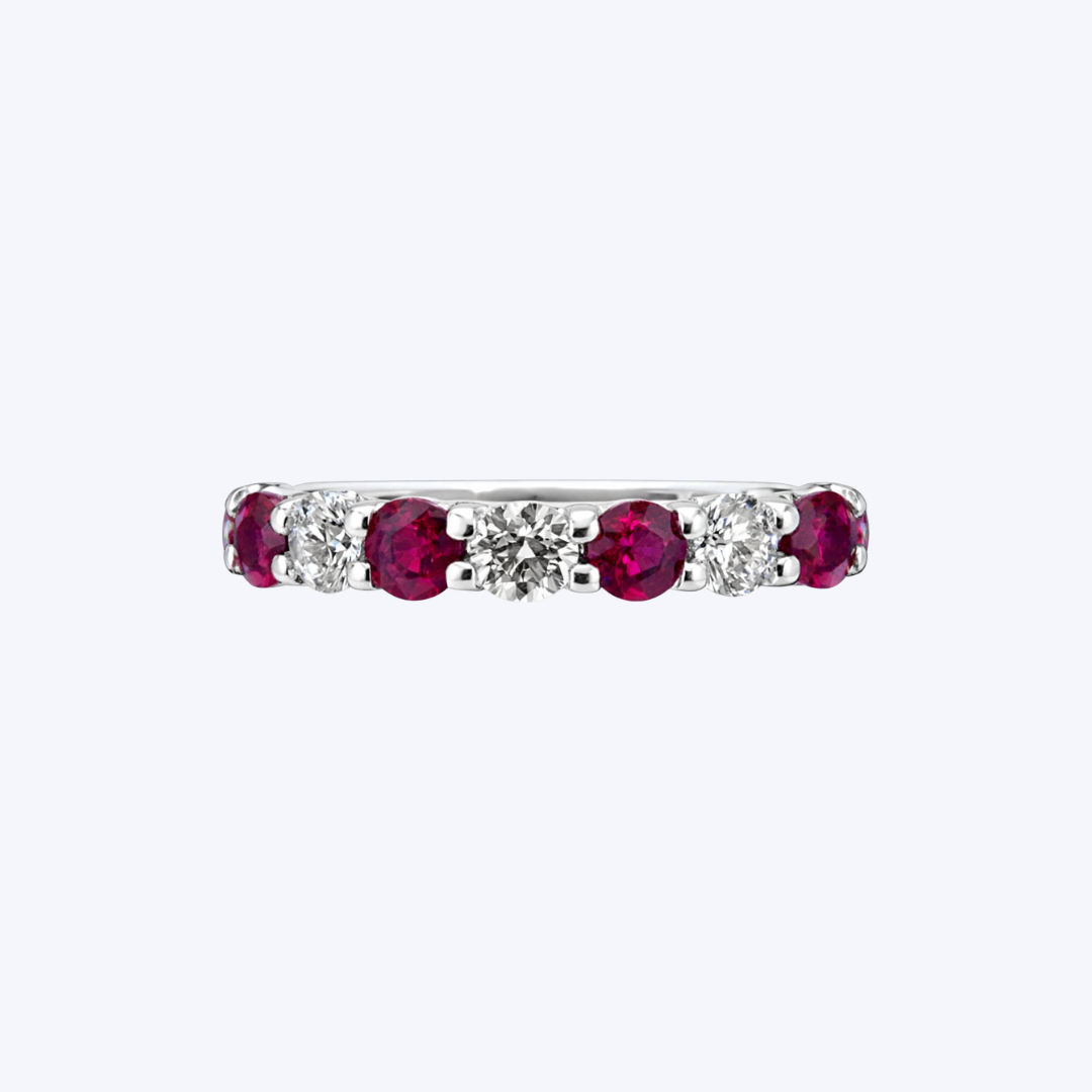 JB Star's stunning Ruby and Diamond Anniversary Band. These stunning four rubies and five round diamonds are handcrafted in pure platinum.