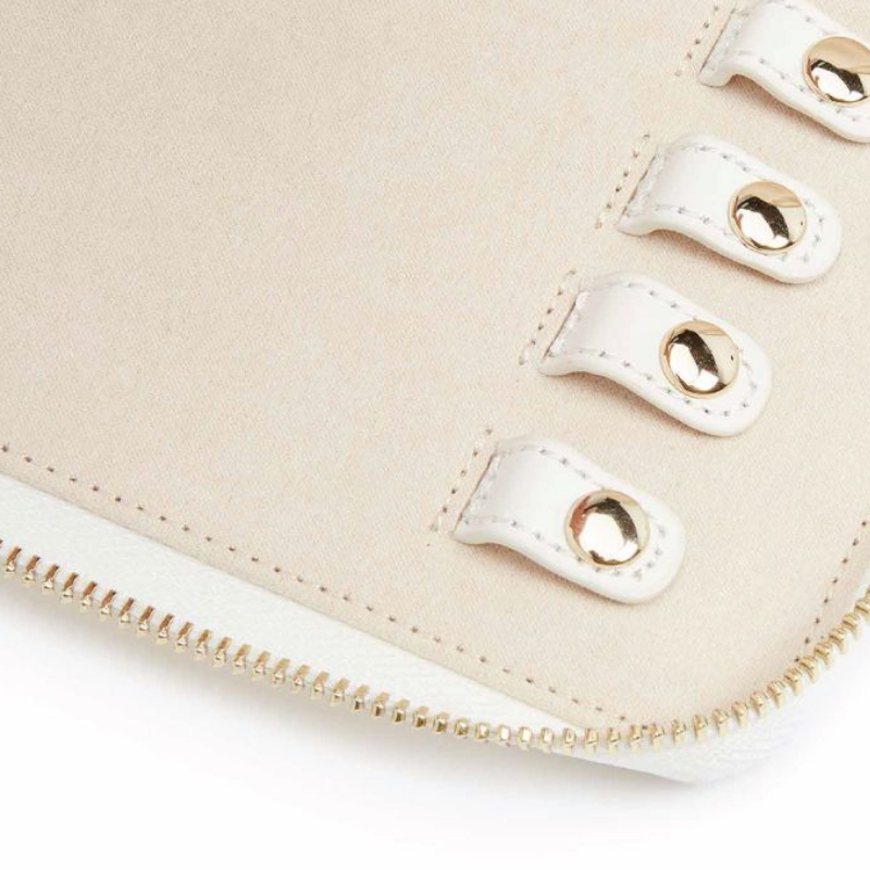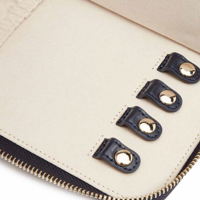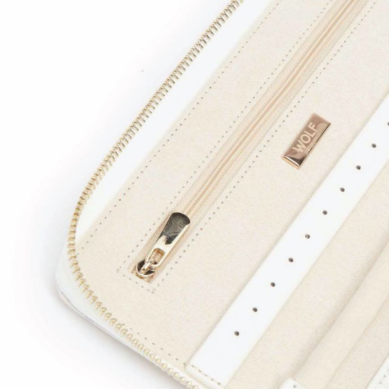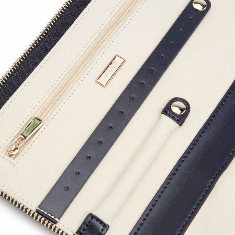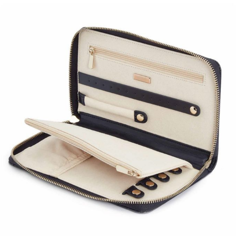 • Storage: 1 earring tab, 1 ring tab, 2 zip compartments, 4 snap-on necklace hooks with pocket
