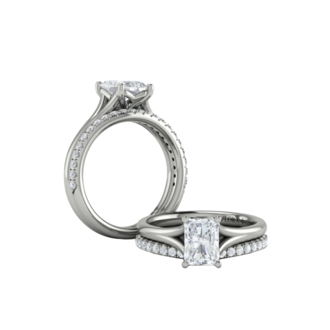 Matching Band for Solitaire Emerald Cut Engagement Ring. A romantic ode to one love forever, this solitaire engagement ring features an elegant emerald cut diamond, elevated by a graceful cathedral setting. The flowing split shank engagement ring design adds sophistication, allowing the light to dance effortlessly around the stone. Minimal yet profound, this simple classic engagement ring design captures the essence of your eternal bond.