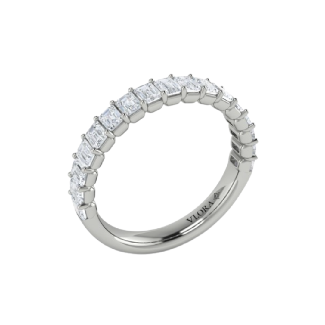 Matching Band for Eterna Oval Engagement Ring with Emerald Cut Band. Art Deco elegance meets modern drama in this oval engagement ring that stands out from the crowd with sophisticated style. Emerald cut accent diamonds blaze across the band, reflecting and refracting like an endless hall of mirrors. The center oval shape diamond is raised in the Vlora signature V-setting, which is beautifully crafted to allow light to enter the stone, maximizing brilliance and radiance. This perfect fit engagement ring will stack beautifully with your wedding band. The unusual combination of oval and emerald cuts is the perfect choice for a woman who's always ahead of the curve.