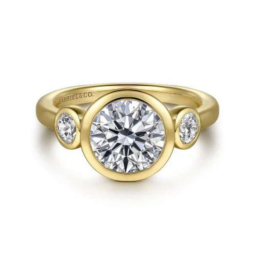 This Gabriel & Co. engagement ring setting features 3 round brilliant cut diamonds all bezel set. The under gallery features a lotus flower design and round cut diamonds along the support band.